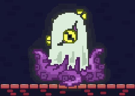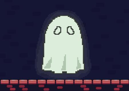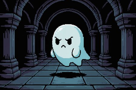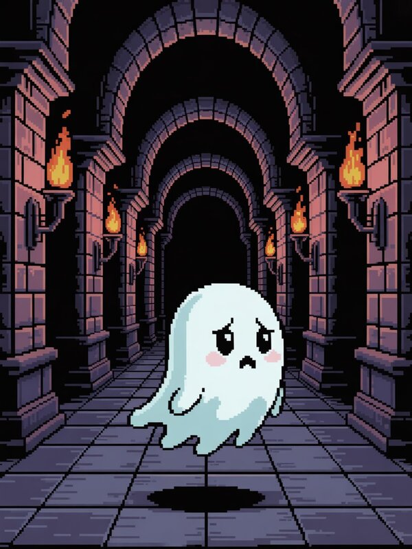 (1) A small, cute, and vulnerable white cartoon ghost protagonist for a 2D platformer game. It has a simple, round shape with soft glow. Its expression is slightly sad and determined. It floats in a dark, gothic castle corridor with dim lighting. Stylized as low-resolution pixel art, 32×32 sprite, with a limited color palette of dark blues, purples, and greys, with the ghost being a bright white and light blue. The style is reminiscent of SNES era games like Super Metroid. Dark atmospheric lighting, cinematic, side view.