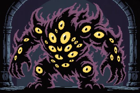 (2) A massive, multi-eyed shadow monster in a dark gothic castle. Its body is made of smoky, shifting purple and black shadows. Dozens of glowing yellow eyes of various sizes open across its form. Low-resolution pixel art, 64×64 sprite, limited color palette: deep purples, blacks, and vivid yellows for the eyes. Style of classic SNES RPG boss battles like in Final Fantasy VI. Dark atmospheric lighting, menacing and stationary, side view.