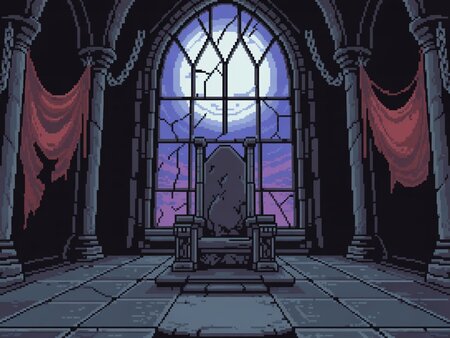(2) Vast, abandoned throne room in a gothic castle. A gigantic, cracked stained-glass window filters dim moonlight in shades of blue and purple. A massive, crumbling stone throne sits empty in the center. Broken banners and chains hang from the pillars. Low-resolution pixel art background, SNES era RPG style (e.g., Final Fantasy). Limited palette: dark indigo, black, desaturated red