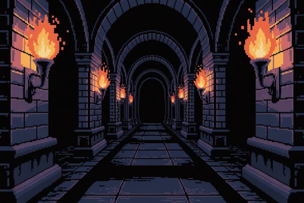 (1) Side-scrolling game background. A long, dark gothic castle corridor with high arches and brick walls. Sconces with flickering torches cast dynamic orange and yellow light, creating pools of illumination and long shadows. Low-resolution pixel art, 16-bit style like Super Nintendo. Limited color palette: deep blues, dark purples, and accents of torch orange. The floor is made of dark cobblestone. Atmospheric, spooky, and deserted.