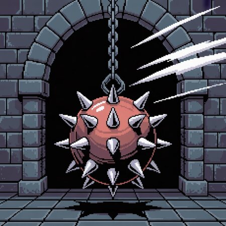 (2) Pixel art, dangerous castle trap. A giant spiked iron ball chained to the ceiling of a gothic archway, mid-swing. The spikes are sharp and menacing. The scene is side-view, in the style of a Super Nintendo platformer. Colors: dark stone walls, black chains, and rusty iron for the ball. Dynamic motion blur on the chain, atmospheric and threatening.
