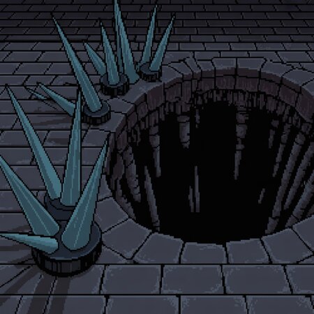 (1) Game environment assets, side-view. Razor-sharp metal spikes emerging from a dark cobblestone floor in a gothic castle corridor. Next to them, a bottomless pit reveals crumbling architecture beneath. Low-resolution pixel art, 32×32 tiles, 16-bit style. Limited color palette: dark grey for stone, black for shadows, and metallic blue for the spikes. Dark atmospheric lighting from a single torch nearby.