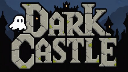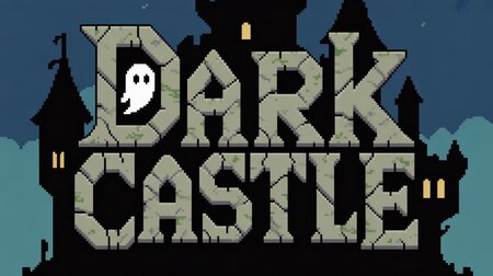 A detailed and atmospheric video game logo for «DARK CASTLE». The text is rendered in a ornate, gothic pixel art font, colored in cracked stone grey with subtle moss green accents. The letters are integrated into the architecture of a dark gothic castle — with towers, arches, and brick textures. A small, determined white ghost with glowing eyes floats through the first letter ’D’. The background shows a moonlit castle silhouette with a few visible glowing yellow windows. The entire design uses a limited 16-bit pixel art color palette: dark blues, stone greys, mossy greens, and the ghost’s white glow. The style is reminiscent of detailed Super Nintendo RPG title screens. The logo feels immersive and tells a story.