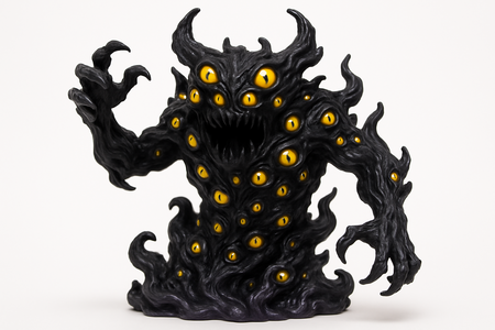 (2) Professional product shot on a pure white background. A detailed figurine of a massive multi-eyed shadow monster. Its body is made of swirled smoky black and purple resin, with dozens of glossy, menacing glowing yellow eyes of various sizes. The sculpt is dynamic and textured. Crisp studio lighting, completely isolated, no text or packaging.