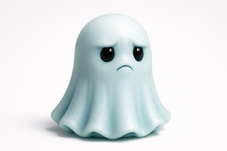 (1) Hyper-realistic product photography, isolated on a pure white background. A highly detailed collectible figurine of a cute, vulnerable white cartoon ghost. The figurine is made of glowing, translucent resin with a soft blueish inner light, capturing its simple round shape and slightly sad, determined expression. Perfect even lighting, sharp focus, no shadows, no text.