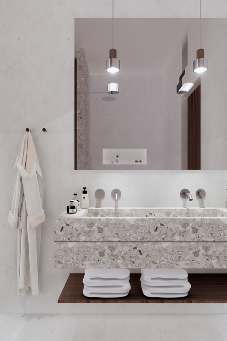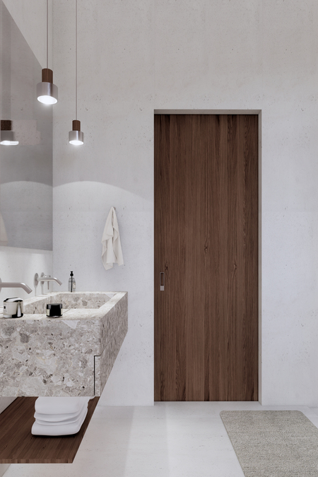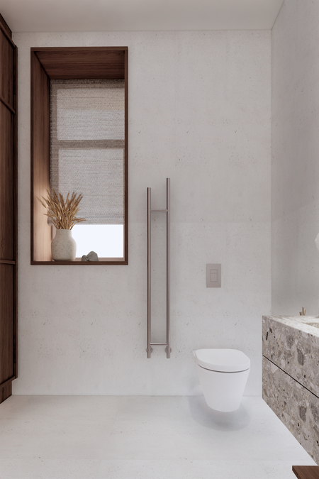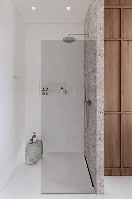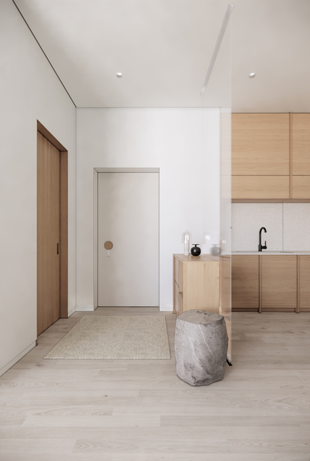 The interior, with its calm colors, simple shapes, and natural materials, serves as a backdrop for the items the family brought back from their travels.