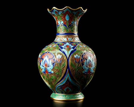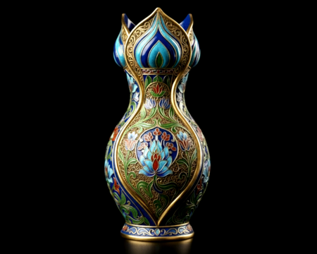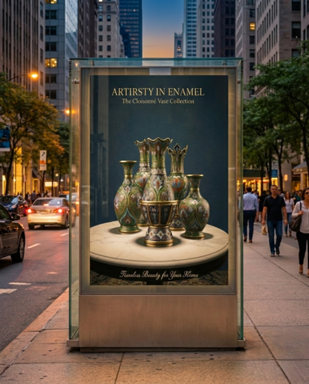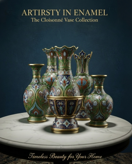Промты: 1. A high-detail, stylized Chinese Cloisonné vase (Jingtailan style). The shape is a slender hourglass with a flared, tulip-like crown mouth. The enamel is predominantly deep cobalt blue and turquoise on the upper section. Features intricate gilded wirework forming lotus and cloud motifs. Highly detailed, artistic rendering, dramatic lighting, rich color saturation. 2. A classic, wide Chinese Cloisonné vase (Jingtailan style) with a bulbous 'Gourd' shape and ruffled rim. The body features saturated emerald green enamel as the primary background color, richly decorated with bold red and light blue Peony and Lotus flowers. Detailed gilded metal wirework. Studio shot, fine art photography style, deep shadows. 3. A tall, slender and elegant Chinese Cloisonné vase (Jingtailan style) with a ruffled mouth. The surface is covered in a uniform vertical pattern of stylized leaves and lotus flowers in softer green, pink, and light purple enamel. Fine, intricate gilded wirework (cloisons). Highly polished, photorealistic rendering, isolated object on a dark background. 4. A complex, multi-tiered Chinese Cloisonné decorative vessel (Jingtailan style), resembling an ornate censer or tripod vase. The lower, bulbous section is dominated by deep cobalt blue enamel and intricate circular geometric patterns. The top section has a crown-like, flared mouth. Richly gilded cloisons, dramatic and opulent, high contrast lighting. 5. A tall Chinese Cloisonné vase (Jingtailan style) standing on a pronounced, trumpet-shaped fluted pedestal. The body is large with a centralized, prominent red and blue Lotus flower motif on a saturated emerald green enamel background. Gilded rims and base details. Fine art object, studio lighting, photorealistic, elegant proportions.