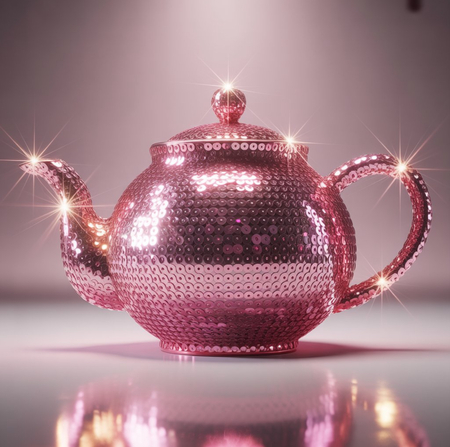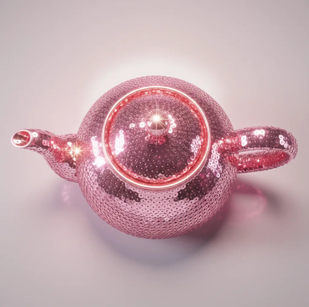 Чайник — Высота: 180 мм — Толщина стенки: 2–3 мм — Материал: PLA или PETG — Технология печати: FDM, 0.2 мм слой — Постобработка: шлифование, грунт, окраска/металлизированный лак Примечание: фактура пайеток может быть выполнена как текстура поверхности или как нанесение после печати.