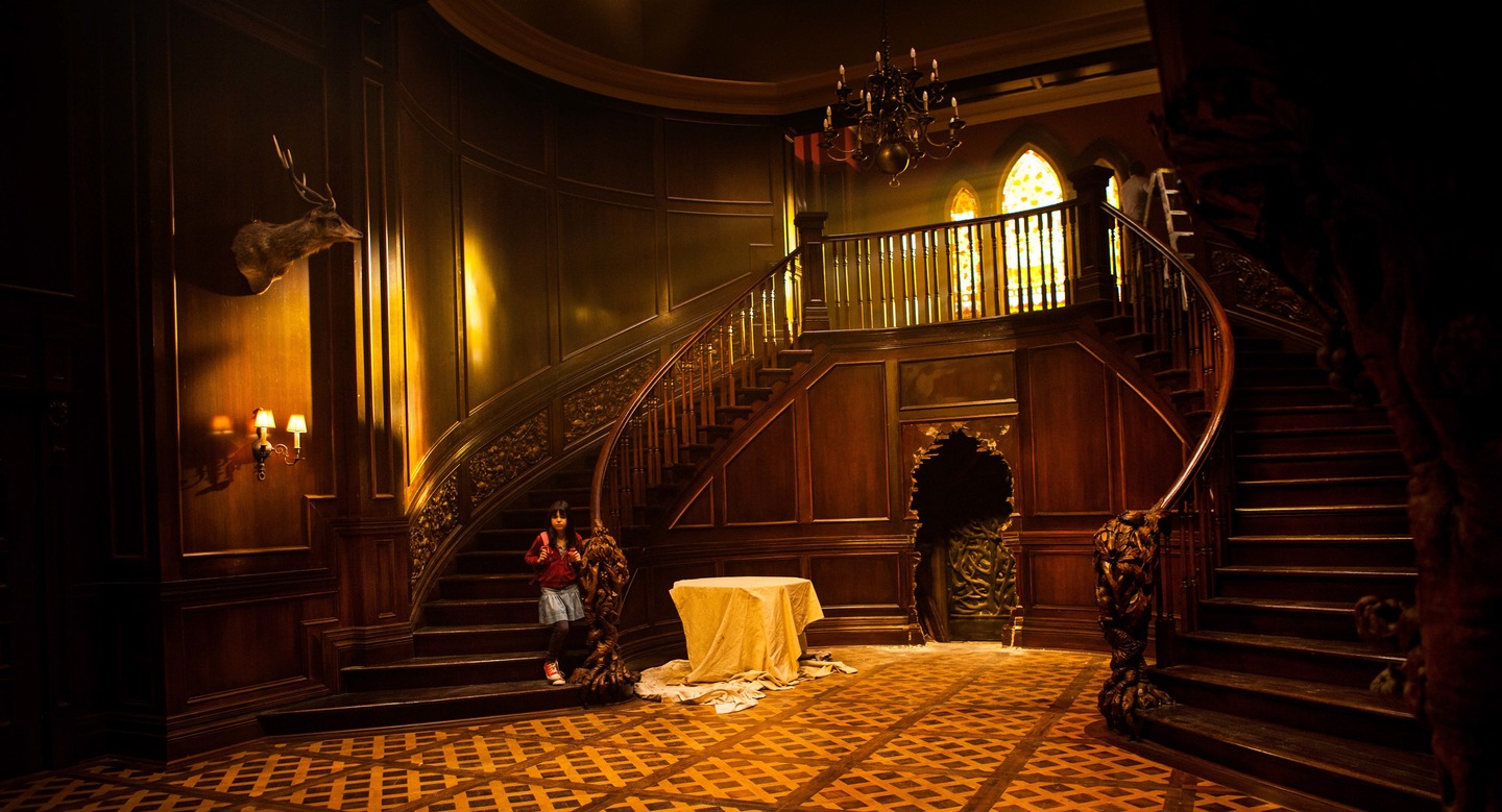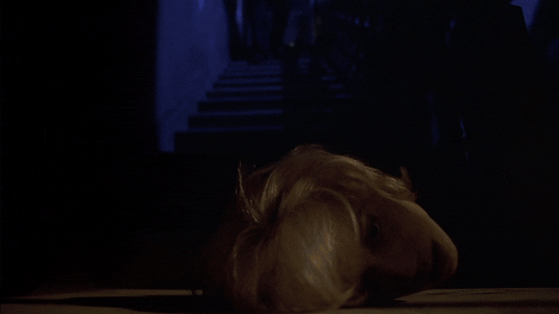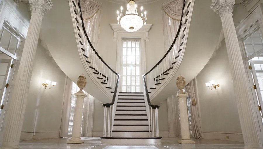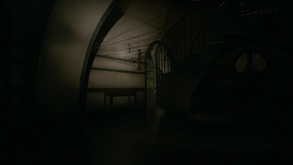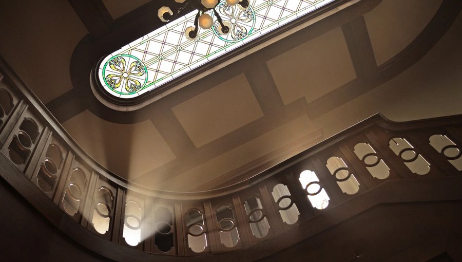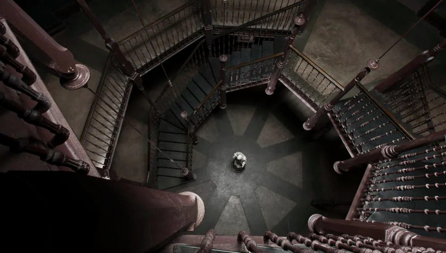 Призрак дома на холме (1999). Сцены с главной героиней Элеонор, которая бродит по огромному особняку, часто включают грандиозные, спиралевидные или многоуровневые лестницы. Её ночные блуждания по ним приводят к ощущению полной изоляции, когда она одна в огромном, давящем пространстве. подчёркивают её одиночество и отделённость от реальности и других персонажей.