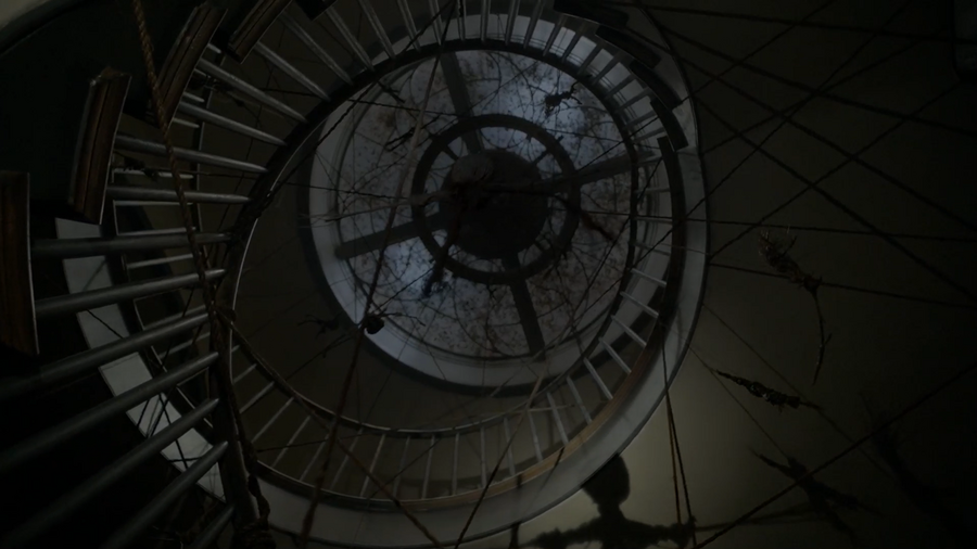 Райан Мерфи использует образ винтовой лестницы как сквозной мотив, превращая её в место ключевых и смертоносных событий в разных сезонах сериала. Как отмечает Алайна Уркхарт-Уайт: «В „Доме-убийце“ это была сцена убийства Бена Хармона, в „Психбольнице“ именно оттуда Сестру Мэри Юнис сбросили насмерть, а во „Фрик-шоу“ она была показана до того, как мама Дэнди приняла кровавую ванну. В первом эпизоде 6-го сезона на этой лестнице сестра Шелби и Мэтта нашла все эти жуткие, похожие на „Ведьму из Блэр“ фигурки из веток» (Urquhart-White, 2016).