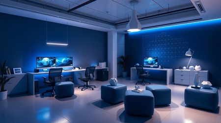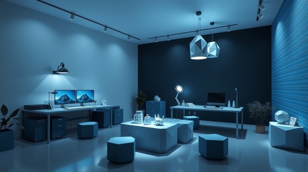 Результат: Modern creative office of a 3D design studio, captured in soft studio lighting, in a dark blue and white color palette. Spacious, minimalistic workspace with a clean futuristic layout. Desks with dual monitors showing 3D modeling scenes, subtle blue screen glow reflecting on nearby surfaces. A few 3D prints and clay models neatly placed around. Stylish geometric furniture — cube-shaped stools and polygonal decor pieces in blue and white tones, hanging lamps shaped like low-poly models. One wall features a subtle UV-grid texture pattern in light blue over dark surfaces, referencing 3D mapping. Realistic materials, soft shadows, calm creative atmosphere, high-resolution professional interior photo, clean design and balanced lighting.