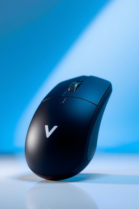 А теперь напиши промт для генерации синей мышки в буквой V на корпусе в таком же освещение